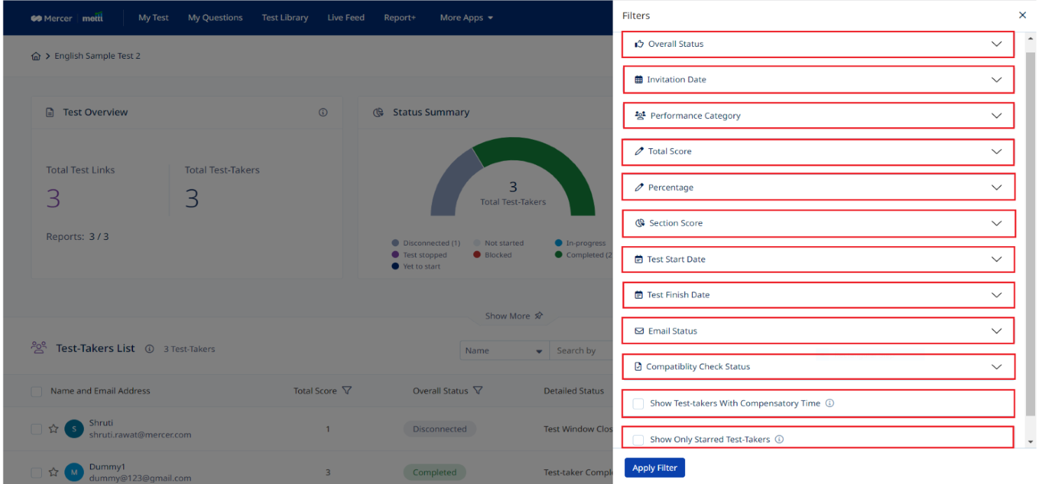 1. Overall Status: The journey of the test taker from yet to start to complete can be filtered by checking on overall status.